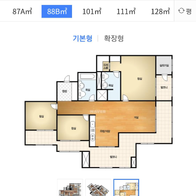 59B 형은 판상형으로 사실 내 취향 기준 A 보다 구조가 낫다고 할 수 없다. 물론 부엌도 거실처럼 사용할 수 도 있는 장점도 있지만 거실과 가장 큰 침실이 남쪽을 향하는 2 bay에, 통풍에는 당연히 불리하다 할 수 있고, 현관 앞 복도가 버려진다는 느낌을 버릴 수가 없다.