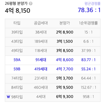공고문의 59A 공급 세대수는 91인 반면 B는 419이다. 그렇다면 경쟁률로 보자면 당연 4배의 공급인 B 타입 아니겠는가. 물론 사람들이 어떤 선택을 할지 알 수 없지만, 나는 나의 취향보다는 가능성을 바라보았다. (당첨 후 모델하우스에서 59를 직접 보니 부엌+거실을 함께 사용하여 큰 거실을 쓸 수 있다는 점이 나에게는 굉장히 큰 장점으로 다가왔다. 그래서 일부러 아일랜드는 버리려고 따로 옵션을 추가하였다.)