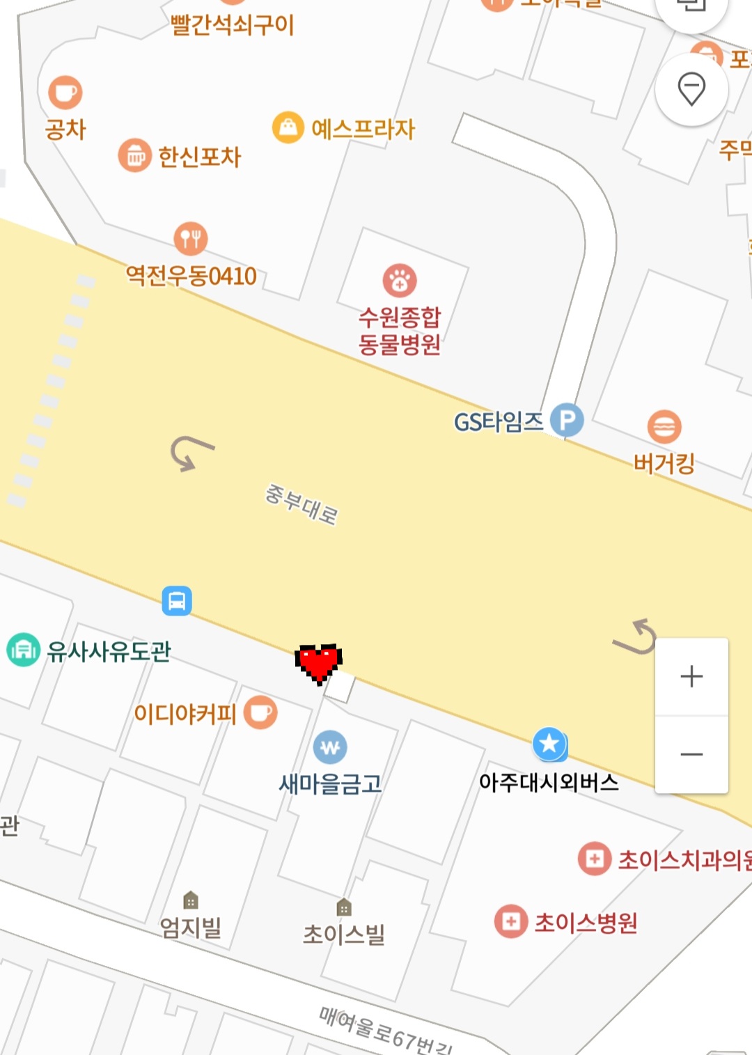 네이버 지도 앱에 아주대시외버스 를 검색하면 나오는 곳보다 ♥로 표시한 곳이 조금 더 정확한 위치라고 할 수 있다.